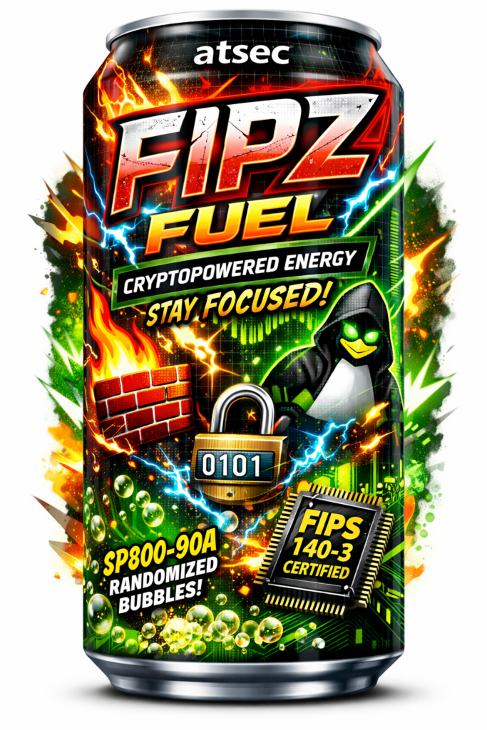 AUSTIN, TX – atsec information security, the globally recognized leader in cryptographic testing today announced its most audacious product yet: FIPZ FUEL™, the world’s first commercially available, cryptographically secure, FIPS 140-3-validated energy drink.